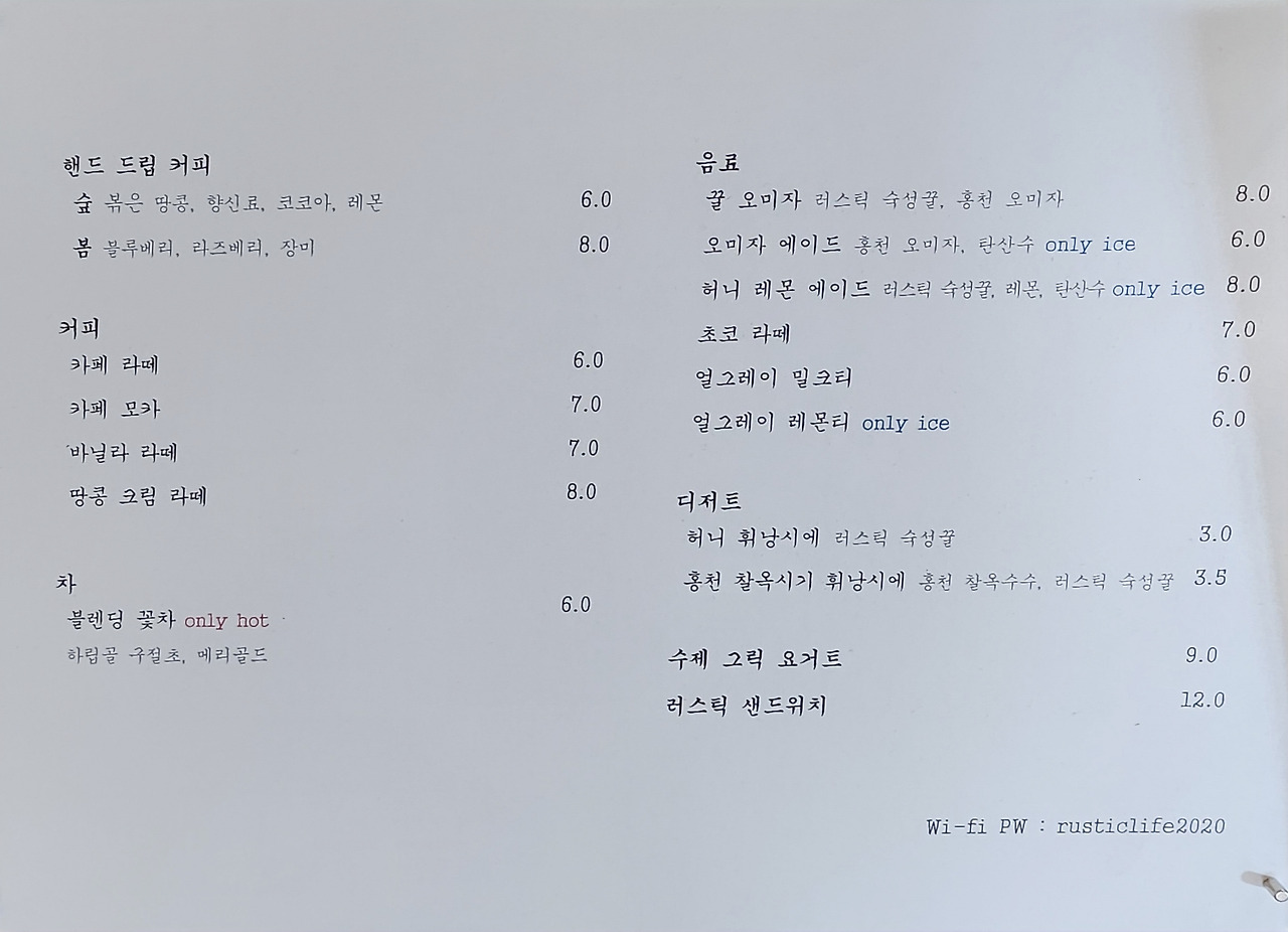 아쉬웠던 것 이상으로 평화로운 분위기와 프라이빗한 룸까지 이용할 수 있기에 행복한 시간을 보낼 수 있는 카페였습니다. 시골의 감성이 강해서 예쁜 카페를 찾기 힘들었던 홍천에서 편안함과 행복을 느낄 수 있는 러스틱라이프를 함께 알아볼까요?
