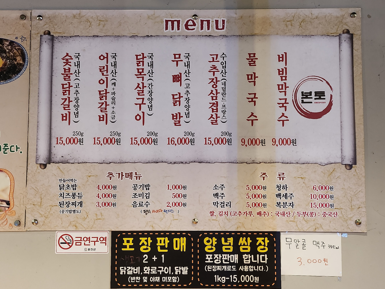 홍천맛집 본토의 메뉴는 닭갈비, 목살구이, 닭발 등의 다양한 메뉴를 만날 수 있었지만, 하나 같이 맛있어 보이는 메뉴 중 유독 눈에 띄었던 것은 닭목살구이였습니다.
